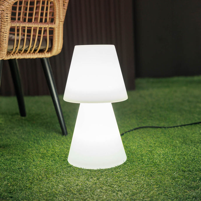 Está fabricado en polietileno para utilizarla en el exterior, puedes elegir entre el acabado con cable y la opción sin cables de batería recargable y permite escoger entre luz cálida o fría.