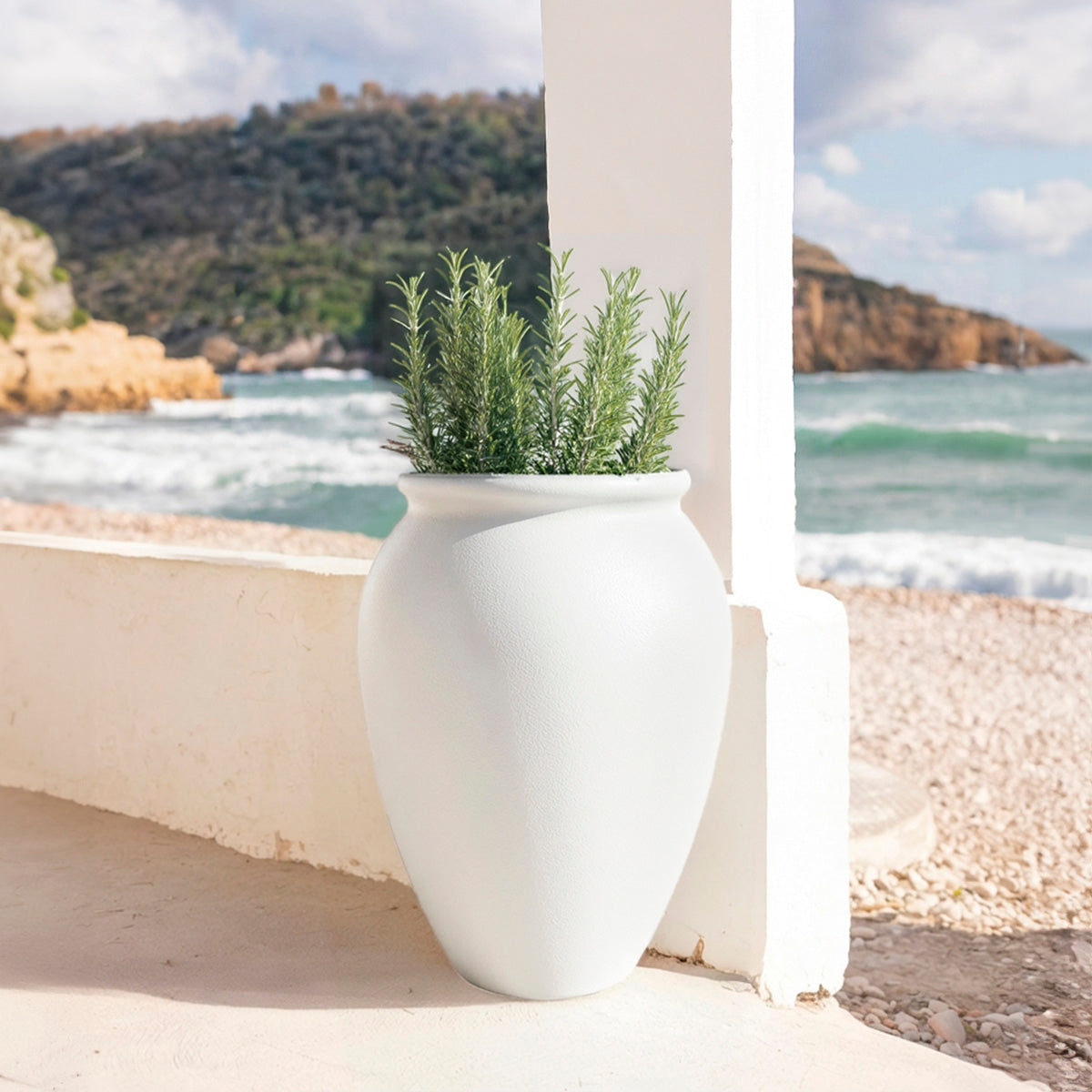 Le pot rond Begonia dispose d'une bonne base de plantation. Lignes arrondies et texture lisse. Disponible en blanc et beige.